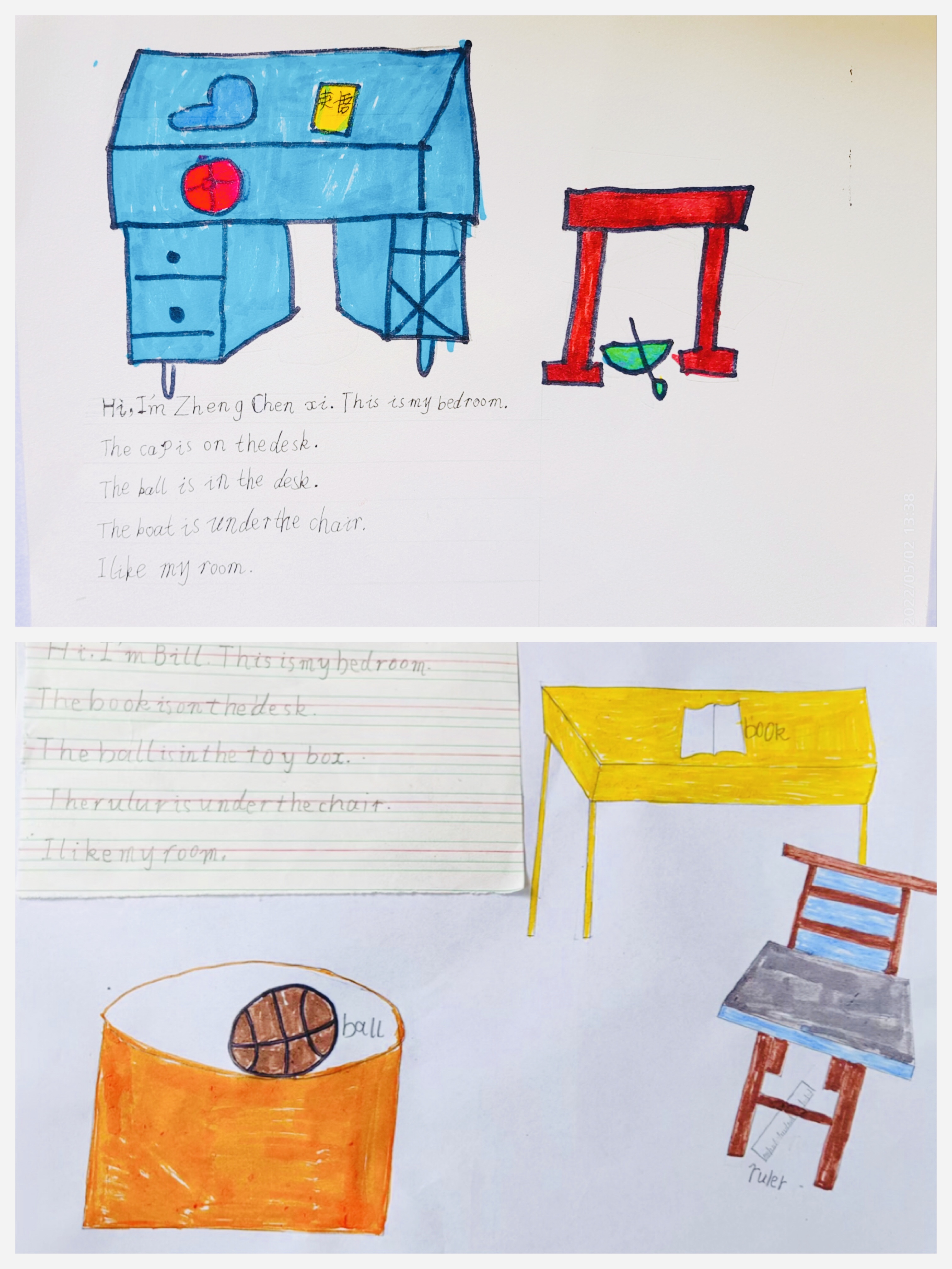 第四单元学习有关房间房间物品及其摆放,为了巩固房间物品词汇及掌握方位词,我结合第四单元所学重点词汇,让孩子们脱离机械性的抄写,布置孩子们回家进行My room 主题画创作的活动。让孩子们真正掌握方位介词及其用法。